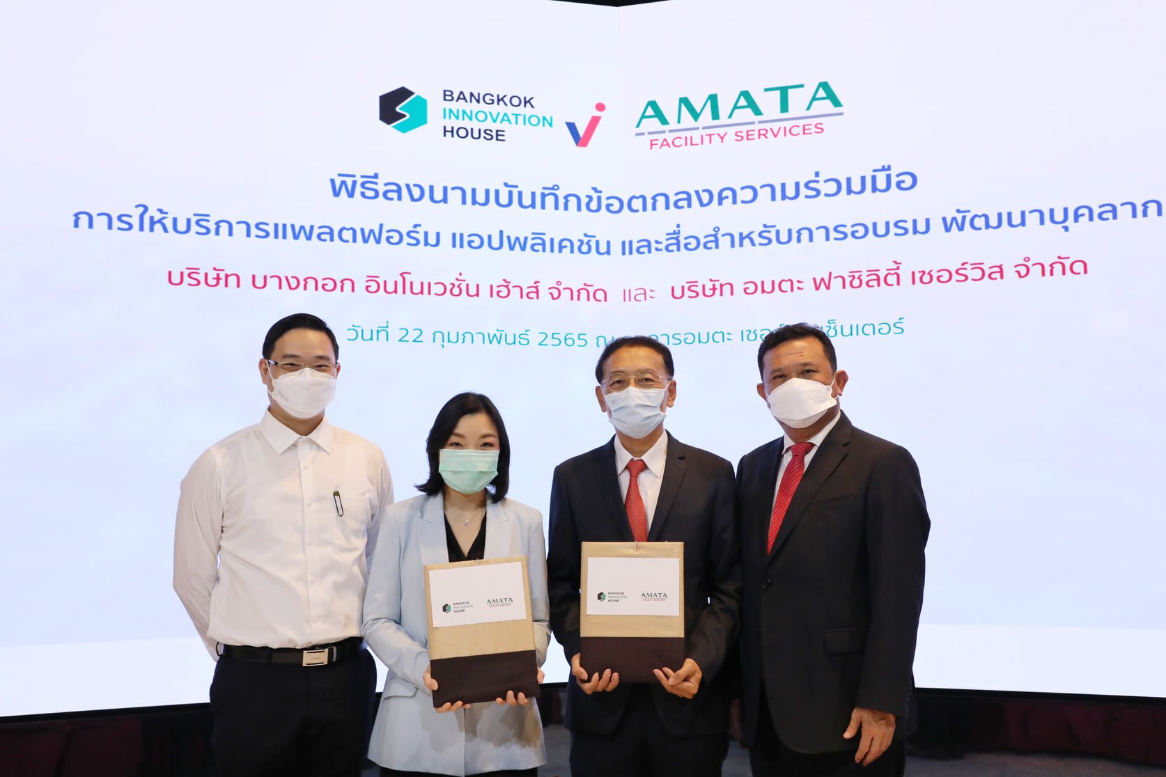 เมื่อวันที่ 24 กุมภาพันธ์ 2565, นายวิบูลย์ กรมดิษฐ์ กรรมการและประธานเจ้าหน้าที่การตลาด บมจ.อมตะ คอร์ปอเรชัน พร้อมด้วย นายอัครเรศร์ ชูช่วย กรรมการผู้จัดการ บริษัท อมตะ ฟาซิลิตี้ เซอร์วิส จำกัด ร่วมลงนามในบันทึกข้อตกลงความร่วมมือว่าด้วยการให้บริการแพลตฟอร์ม แอปพลิเคชั่น และสื่อสำหรับการอบรม พัฒนาบุคลากร กับบริษัท บางกอก อินโนเวชั่น เฮ้าส์ จำกัด หรือ BIH ซึ่งเป็นผู้ให้บริการแพลตฟอร์มและคอร์สออนไลน์เพิ่มศักยภาพพัฒนาทักษะฝีมือเเรงงานไทย โดยเฉพาะภาคอุตสาหกรรมภายในสถานประกอบการอมตะซิตี้ ชลบุรี อมตะซิตี้ ระยอง และประชาชนทั่วไป ณ อาคารอมตะเซอร์วิส เซ็นเตอร์ อมตะซิตี้ ชลบุรี