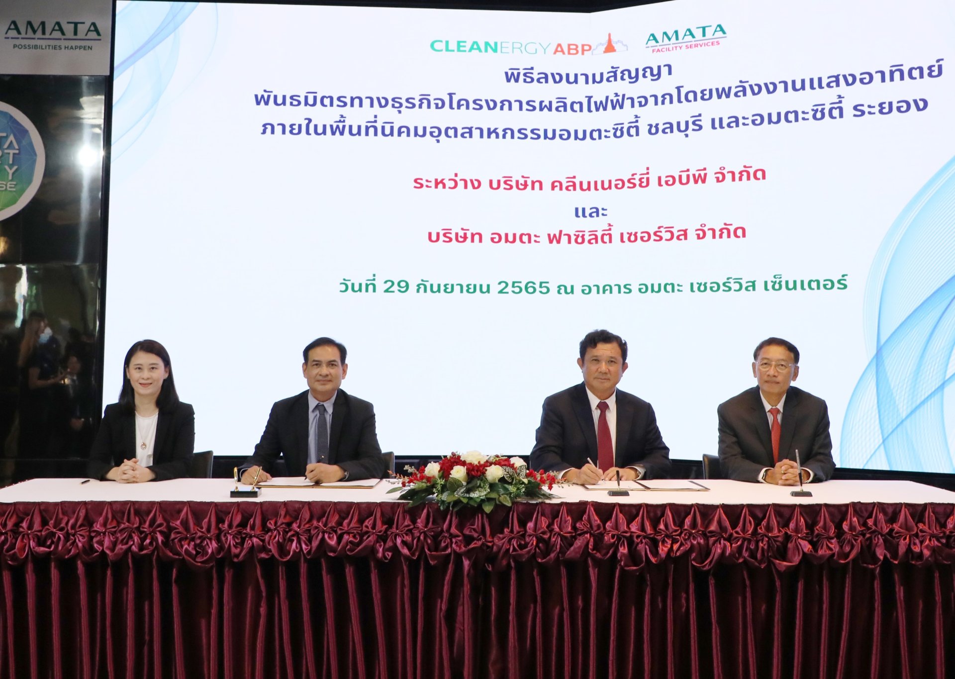 บริษัท อมตะ ฟาซิลิตี้ เซอร์วิส จำกัด (Amata Facility Services) นำโดยคุณวิบูลย์ กรมดิษฐ์ กรรมการ และ คุณอัครเรศร์ ชูช่วย กรรมการผู้จัดการ ร่วมลงนามสัญญาพันธมิตรทางธุรกิจกับ บริษัท คลีนเนอร์ยี่ เอบีพี จำกัด (Cleanergy ABP) นำโดย คุณอภิเชษฐ นุ้ยตูม ประธานเจ้าหน้าที่บริหาร ในโครงการผลิตและจำหน่ายไฟฟ้าจากพลังงานแสงอาทิตย์ชนิดติดตั้งบนหลังคา หรือโซลาร์ รูฟท็อป (Solar rooftop) ให้แก่กลุ่มลูกค้าอุตสาหกรรม ภายในนิคมอุตสาหกรรมอมตะซิตี้ ชลบุรี และนิคมอุตสาหกรรมอมตะซิตี้ ระยอง เพื่อสนับสนุนการใช้พลังงานสะอาดในภาคอุตสาหกรรมของประเทศไทย มุ่งสู่องค์กรที่ปล่อยคาร์บอนสุทธิเป็นศูนย์ (Net-Zero Carbon Emissions) ตามแนวทางการดำเนินธุรกิจอย่างยั่งยืน พิธีลงนามดังกล่าวจัดขึ้น ณ อาคารอมตะ เซอร์วิส เซ็นเตอร์ นิคมอุตสาหกรรมอมตะซิตี้ ชลบุรี