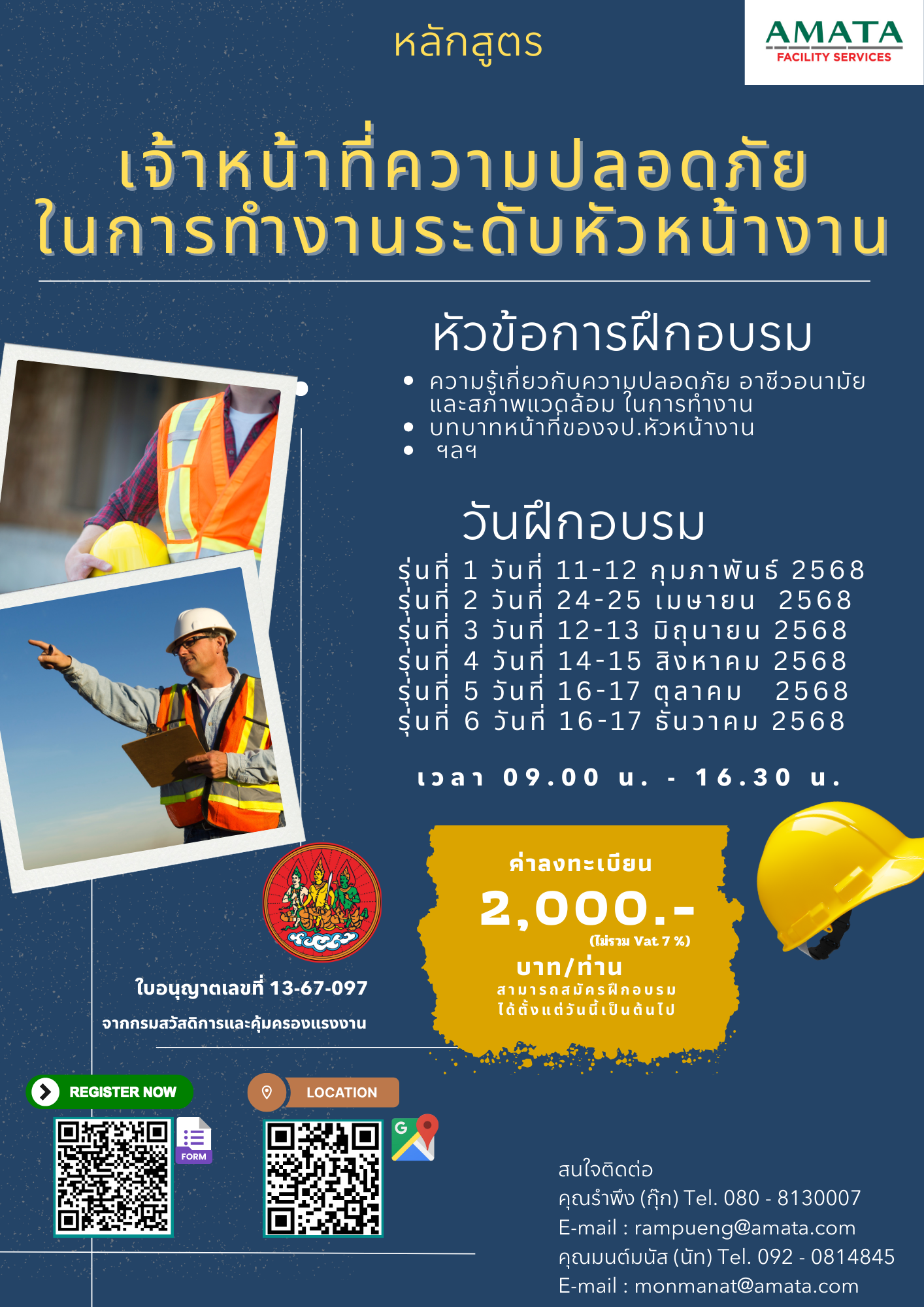 | 16-17 ธ.ค. 2568 | เจ้าหน้าที่ความปลอดภัยในการทำงานระดับหัวหน้างาน | 20 คน | |