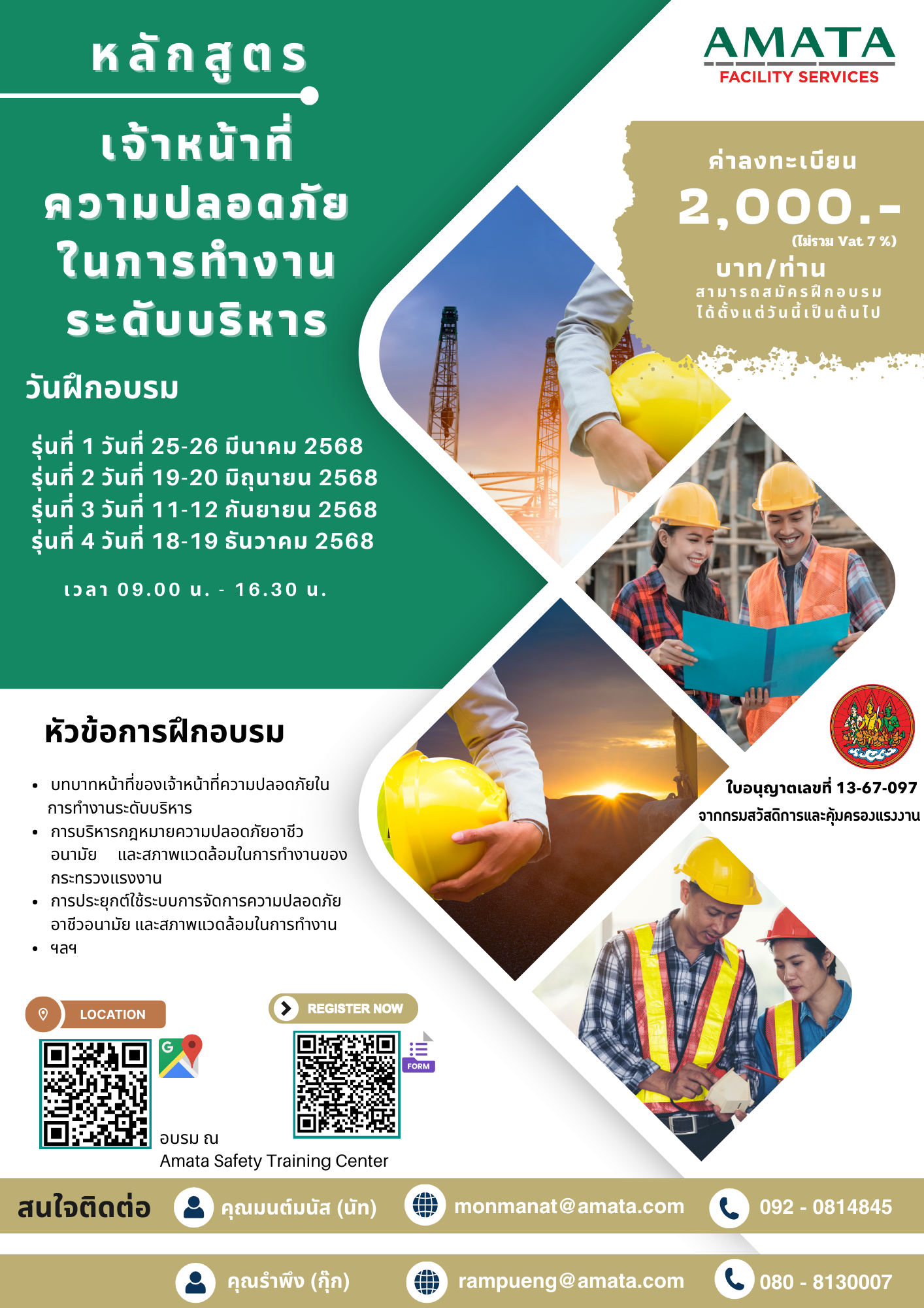 | 11-12 ก.ย. 2568 | เจ้าหน้าที่ความปลอดภัยในการทำงานระดับบริหาร | 20 คน | |