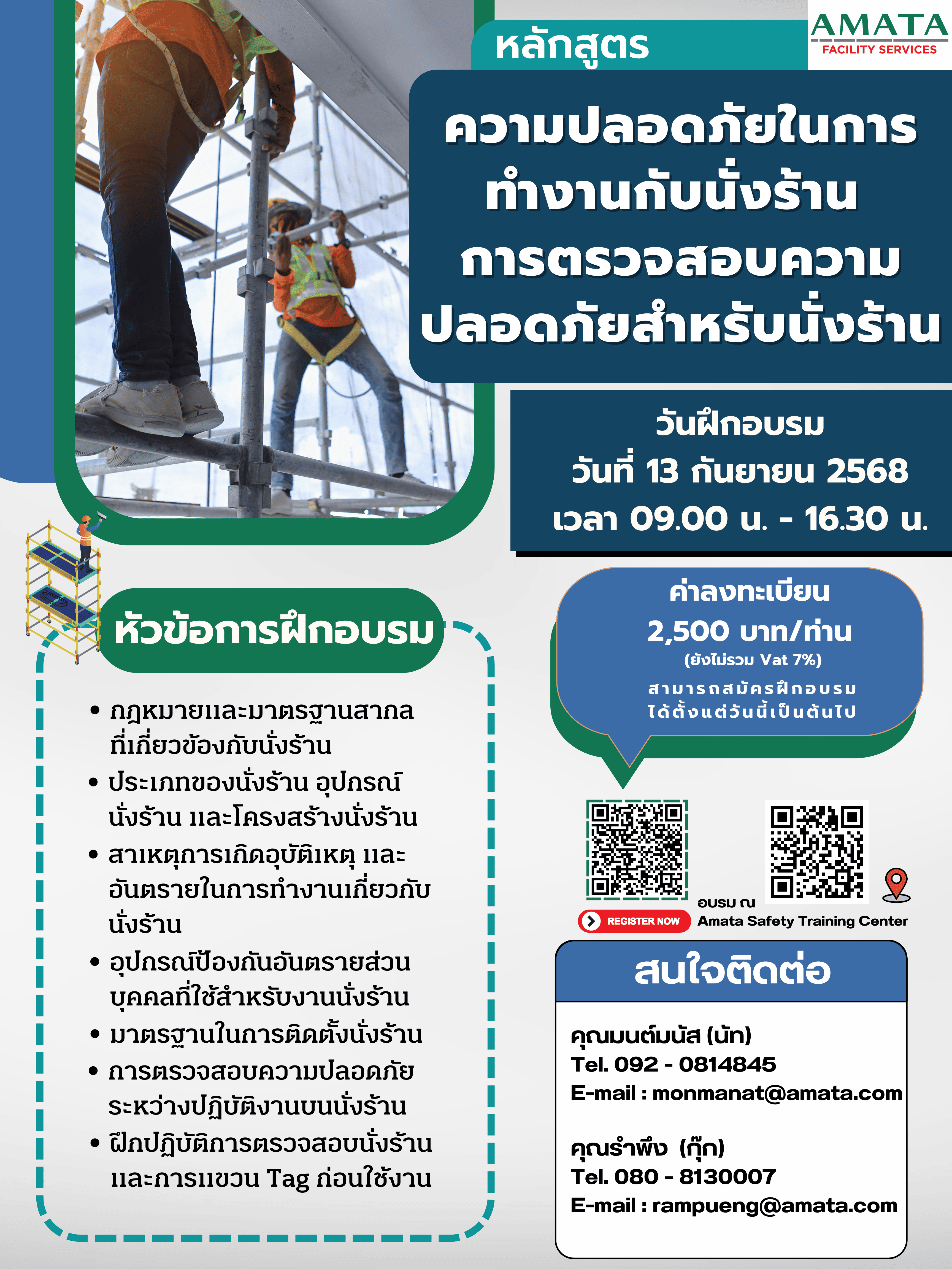 | 13 ก.ย. 2568 | ความปลอดภัยในการทำงานกับนั่งร้าน การตรวจสอบความปลอดภัยสำหรับนั่งร้าน | 20 คน | |
