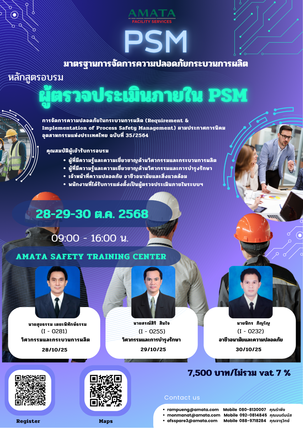 | 16-17 ต.ค. 2568 | เจ้าหน้าที่ความปลอดภัยในการทำงานระดับหัวหน้างาน | 20 คน | |