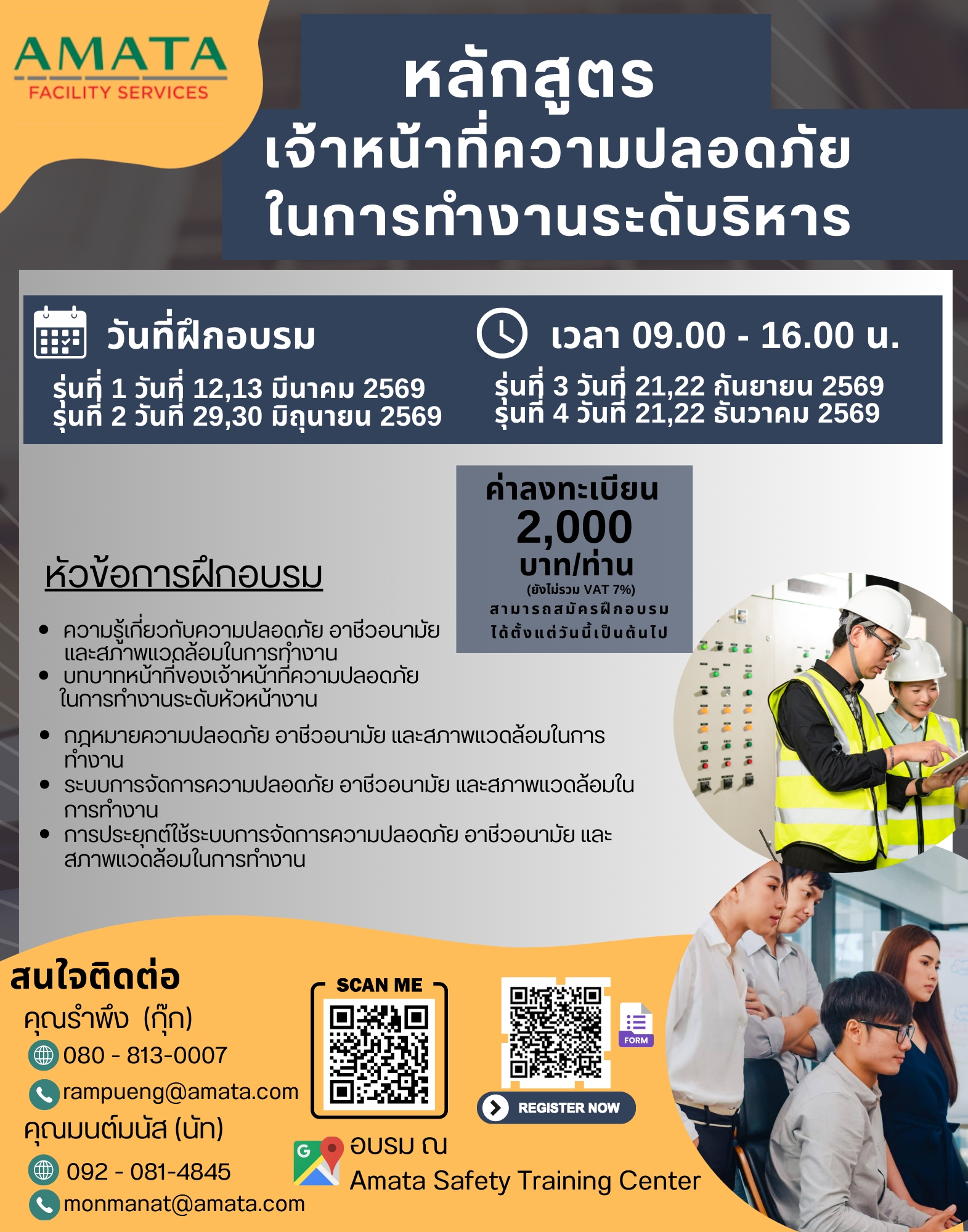 | 12-13 มี.ค. 68 | 12 | 2,000 | เจ้าหน้าที่ความปลอดภัยในการทำงานระดับบริหาร | 20 คน | |