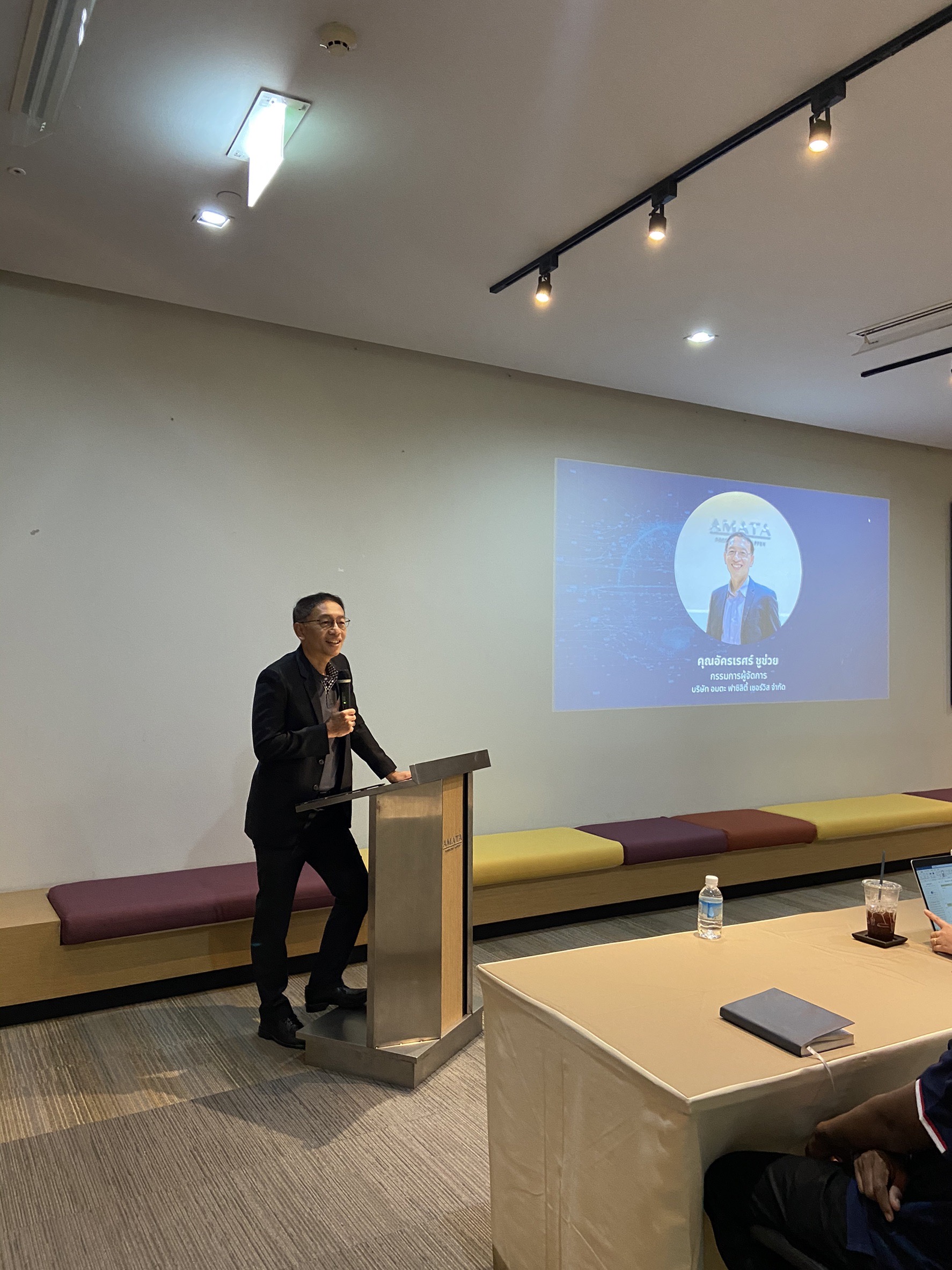 คุณอัครเรศร์ ชูช่วย กรรมการผู้จัดการ บริษัท อมตะ ฟาซิลิตี้ เซอร์วิส จำกัด แจ้งวัตถุประสงค์ในการสัมมนาในครั้งนี้