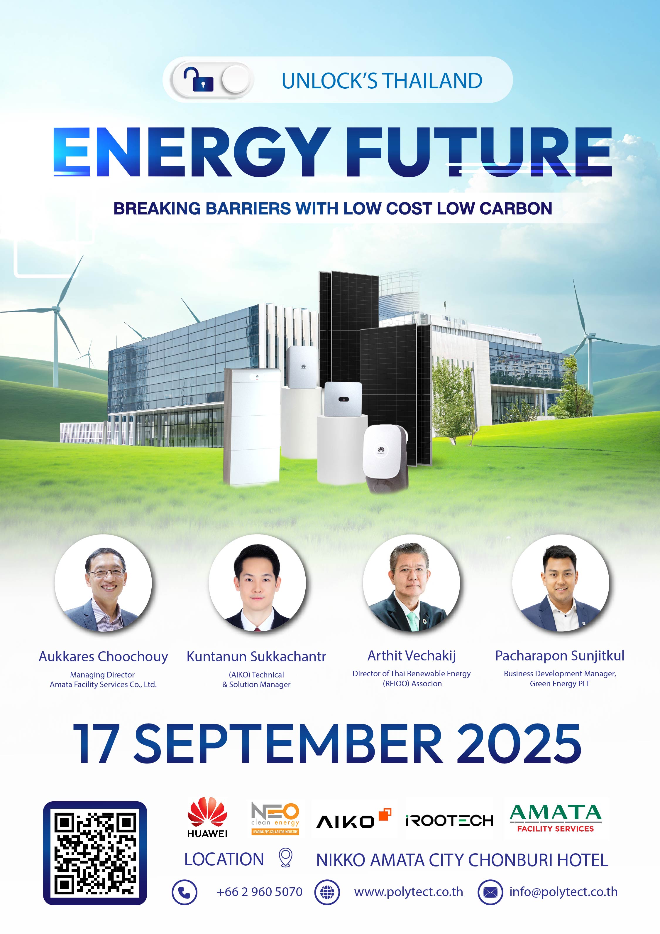 ประเทศไทยกำลังก้าวเข้าสู่ยุคแห่งการเปลี่ยนผ่านด้านพลังงานครั้งสำคัญ งานสัมมนานี้จัดขึ้นเพื่อถ่ายทอดความรู้ แลกเปลี่ยนมุมมอง และเปิดประสบการณ์ใหม่เกี่ยวกับ พลังงานสะอาด ราคาประหยัด และยั่งยืน ที่จะเป็นแรงขับเคลื่อนเศรษฐกิจและสังคมไทยสู่อนาคตที่ดีกว่า