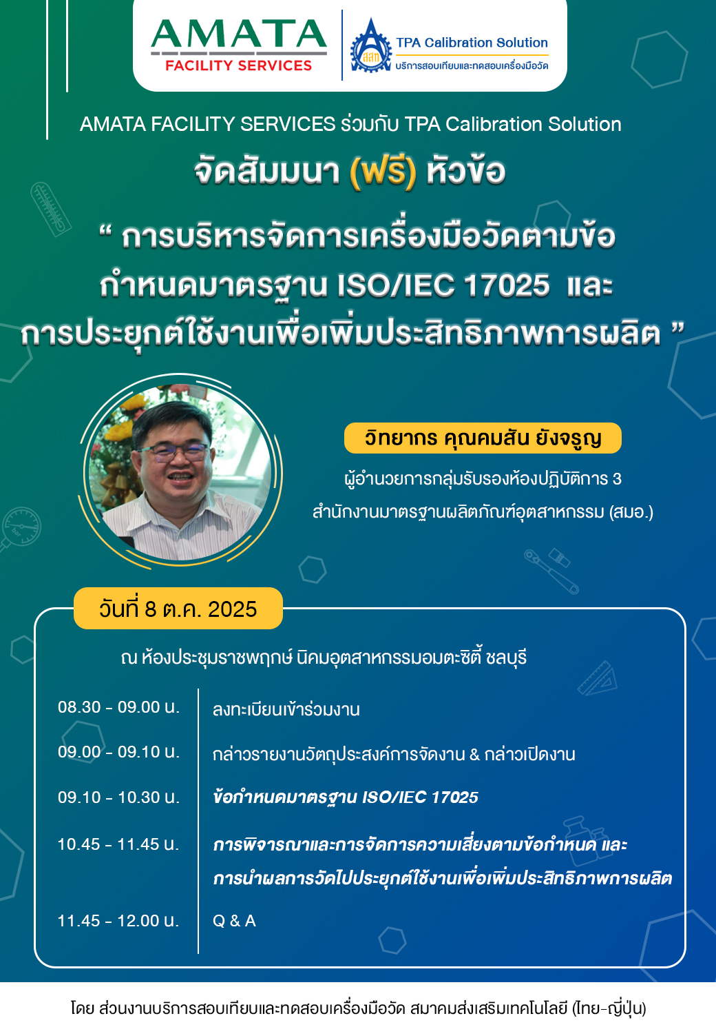 ในยุคที่อุตสาหกรรมต้องแข่งขันด้วยคุณภาพและมาตรฐานการผลิต การบริหารจัดการเครื่องมือวัดอย่างถูกต้องตามมาตรฐานสากลจึงเป็นสิ่งสำคัญ การสัมมนาครั้งนี้จะช่วยให้ท่านเข้าใจหลักการสำคัญของ ISO/IEC 17025 พร้อมทั้งแนวทางการประยุกต์ใช้จริง เพื่อยกระดับประสิทธิภาพการทำงานและเพิ่มความน่าเชื่อถือขององค์กร