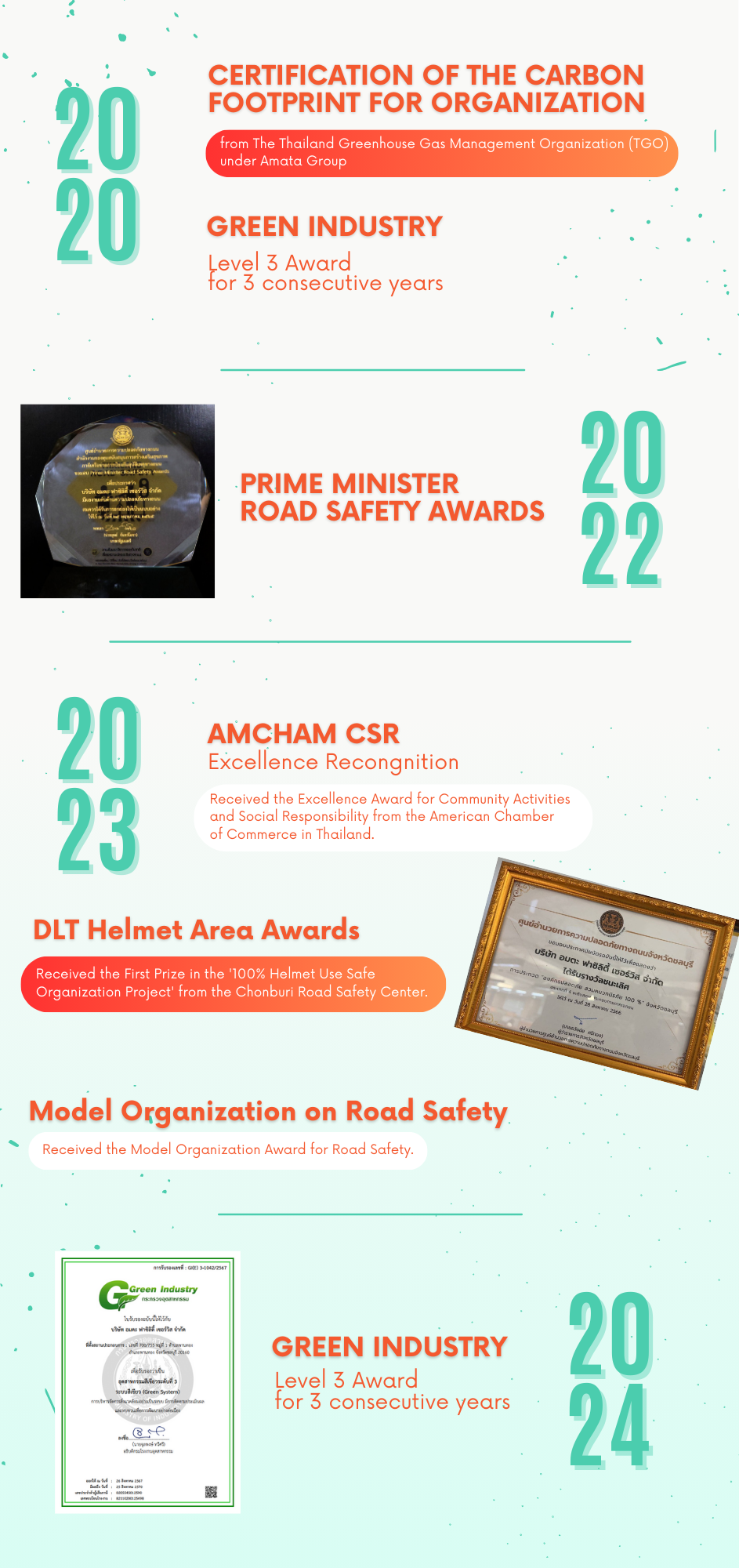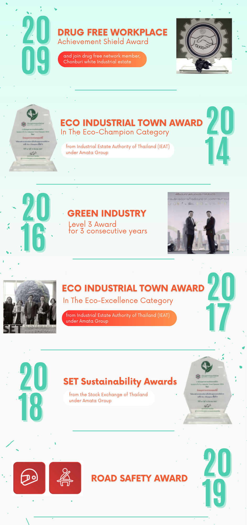 • Eco Industrial Town Award in the Eco Excellence level from Industrial Estate Authority of Thailand (IEAT)