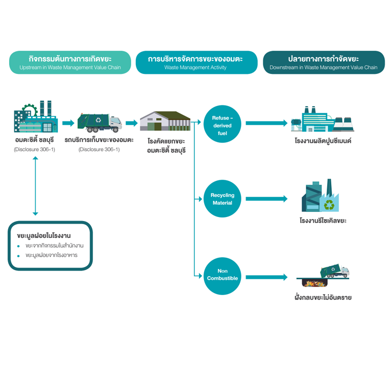 The Company recognizes the impact of waste disposal using landfill methods that generate greenhouse gases, which is a major cause of climate change, therefor the company has set a goal to reduce the amount of solid waste disposed by doing landfilil cover as much as possible by applying the principle of recycling resources for maximum benefit to apply in the service of collecting, separating, sorting and disposing of solid waste in Amata City Chonburi Industrial Estate since 2007.