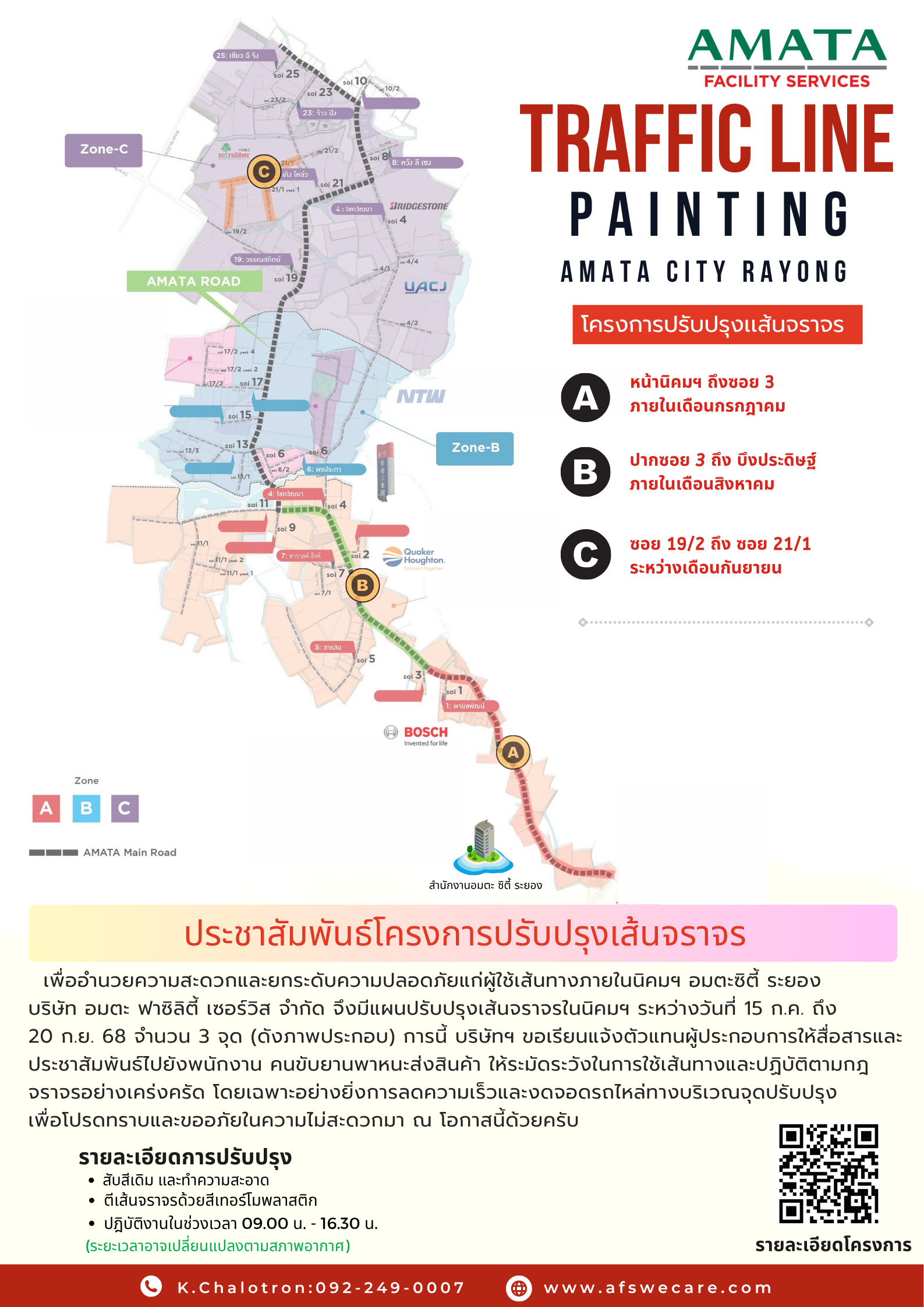 To enhance convenience and improve safety for road users within Amata City Rayong Industrial Estate, Amata Facility Services Co., Ltd. will carry out a traffic line improvement project from July 15 to September 20, 2025, at three designated locations (as shown in the attached diagram).