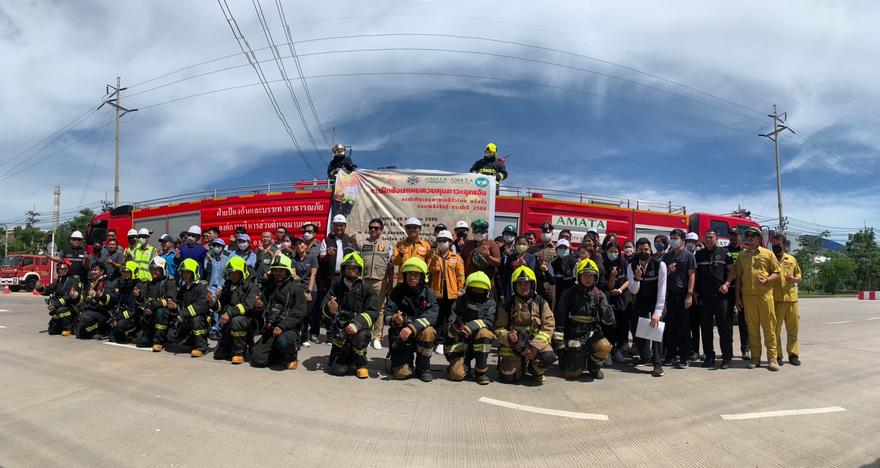 Amata City Rayong Industrial Estate Office, Amata Facility Services Co., Ltd., and Mabyangphon Subdistrict Administrative Organization successfully conducted Annual emergency response rehearsal 2023(Chemical spillage, gas leakage, and fire) which led by Mr. Aukkares Choochouy, Managing Director of Amata Facility Services, Mr.Sermpong Sukko ,Director of Amata City Chonburi Industrial Estate Office ,Mabyangphon Subdistrict Administrative Organization to join in Emergency Response Simulation at Boly Pipe Co., Ltd. The stimulation aimed to enhance preparedness for potential emergencies. Through this simulation exercise, participants practiced emergency response protocols, strengthened communication channels, and familiarized themselves with the effective use of specialized equipment. In addition, organizations demonstrated a shared responsibility to protect the environment and ensure the safety of employees, residents, and neighboring businesses.