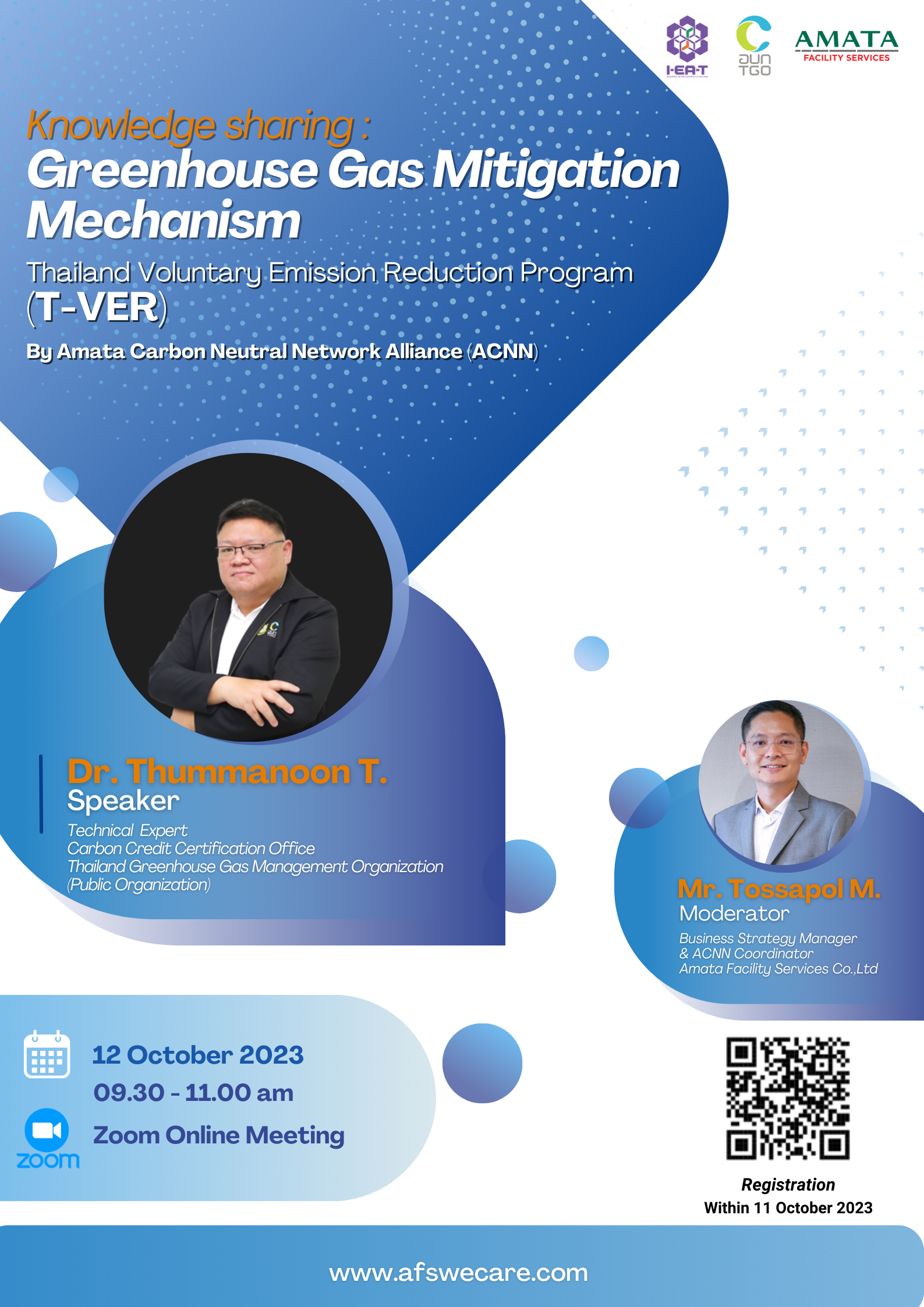 Amata Facility Services Limited cordially invites you to participate in the "T-VER Greenhouse Gas Reduction Mechanism Training" scheduled for Thursday, October 12, 2023, from 09:30 AM to 11:00 AM.