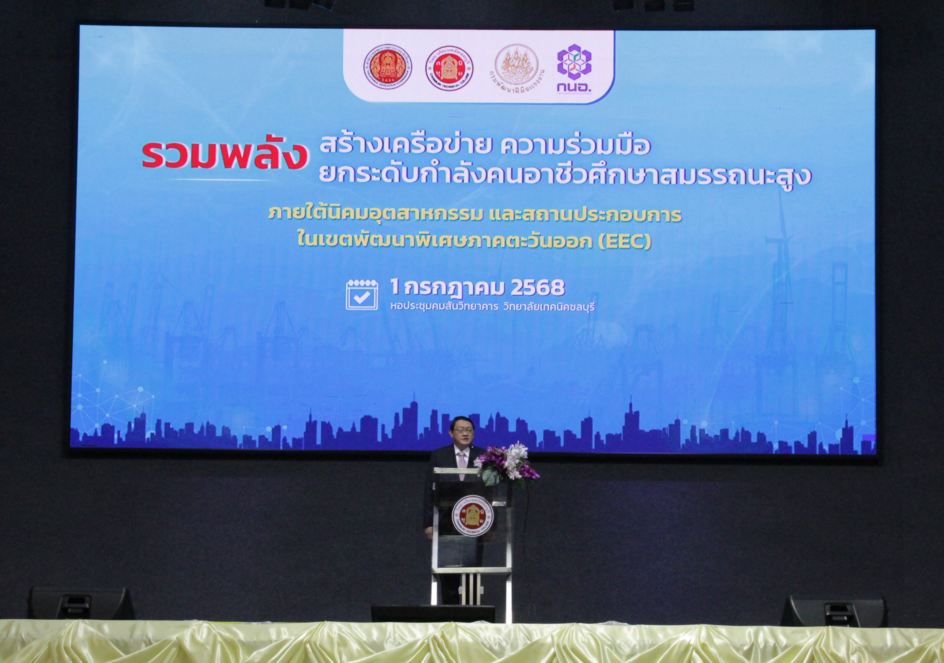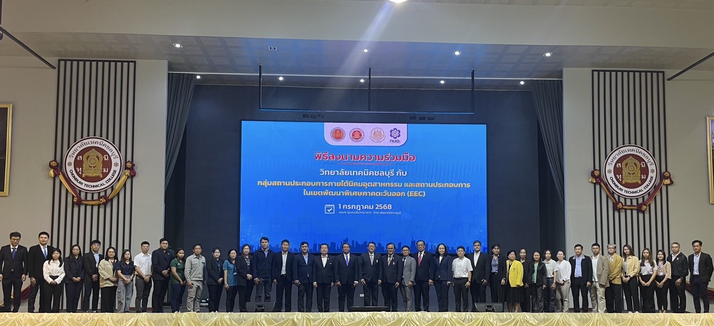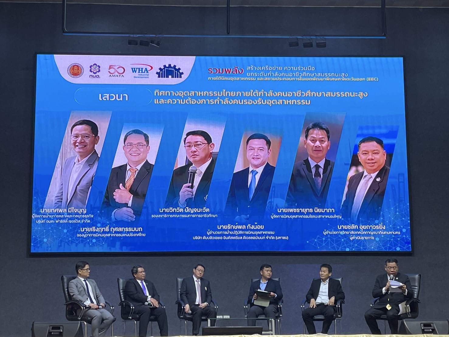 On July 1, 2025, a representative from Amata Corporation Public Company Limited participated in a panel discussion on the topic “Uniting Networks, Expanding Cooperation, and Elevating High-Competency Vocational Manpower.” The event was held within the framework of industrial estates and enterprises in the Eastern Economic Corridor (EEC) at the Khomsan Wittayakarn Auditorium, Chonburi Technical College, Ban Bueng District, Chonburi Province.